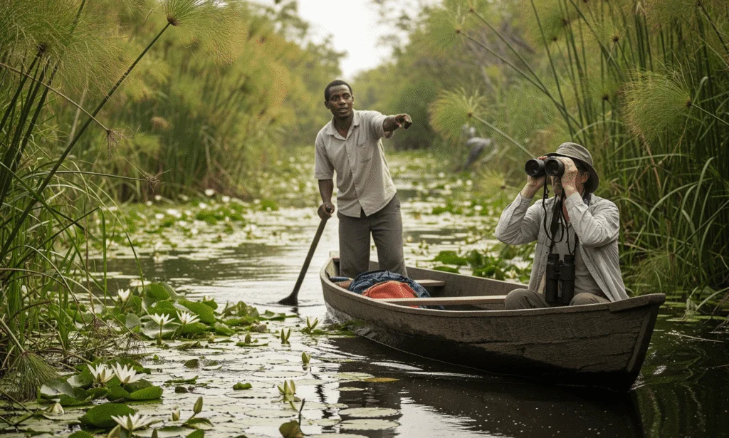 8:30 AM – 11:30 AM: Canoe ride through the swamps to spot the Shoebill and other birds like kingfishers, herons, and jacanas. Ideal for photography enthusiasts.